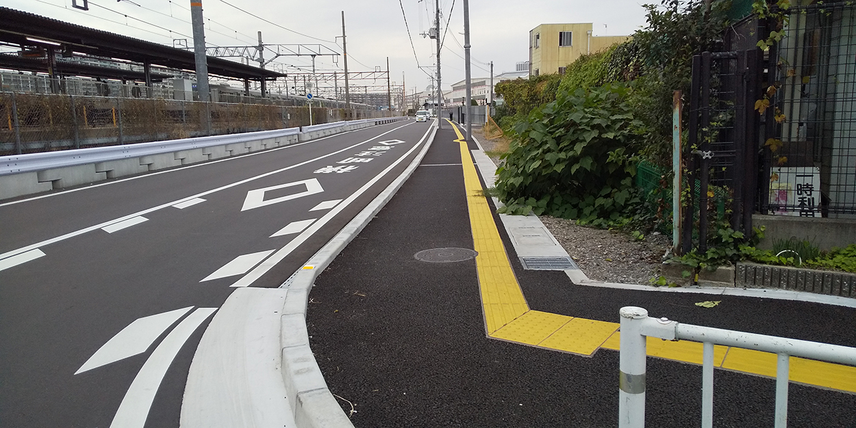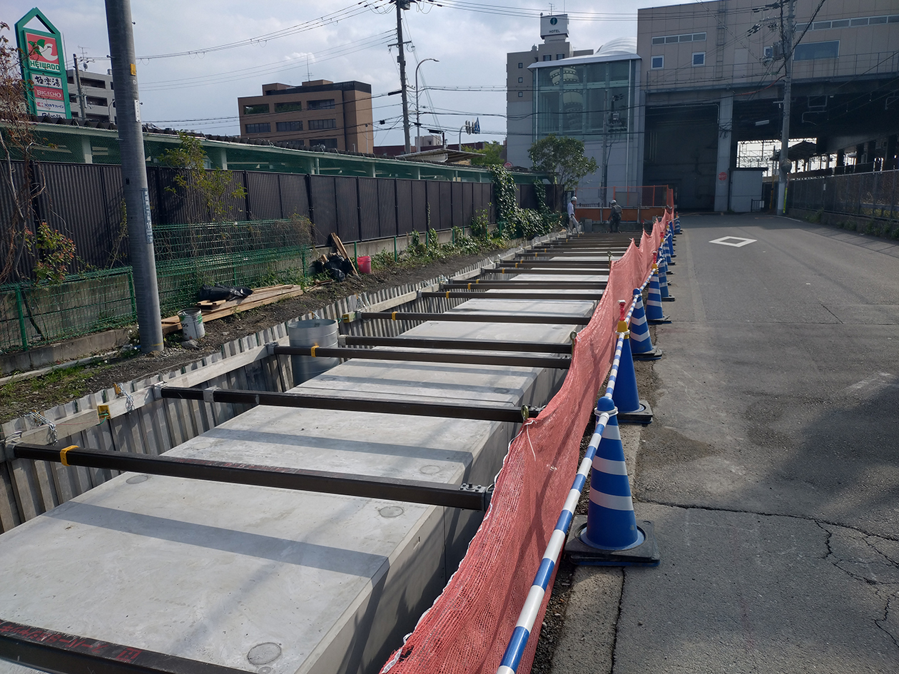 駅前通りであり車の交通量が多く、また製品施工場所が線路沿いかつ狭隘な道路幅員など、製品のストックヤードや施工重機の