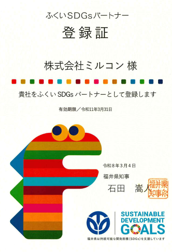 「ふくいSDGsパートナー」に登録されました | 新着情報 | 株式会社ミルコン